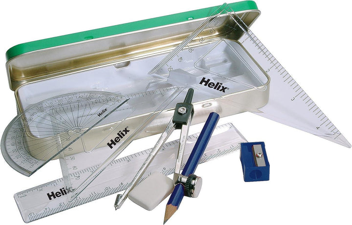 This 8-piece Irish maths/geometry set supplied in a sturdy tin box set contains 6"/15cm clear ruler 45-degree set square 60-degree set square 180-degree protractor Metal self-centring compass (G05) 3.5"/9cm pencil Sharpener Eraser