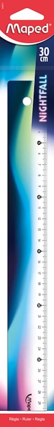 The Maped Nightfall Ruler, 30 cm in blue (245011), is a sleek and modern measuring tool designed for durability and precision. Made from high-quality plastic, this ruler is resistant to breaking and can withstand regular use. It features both metric (centimeters and millimeters) and imperial (inches) units, providing versatility for various measurement needs. The clear and easy-to-read markings ensure accurate measurements, while the bevelled edge allows for smooth and precise drawing lines. Additionally, the ruler's contemporary design, part of Maped's Nightfall series, adds a stylish touch to any desk or workspace. Ideal for students, professionals, and anyone in need of a reliable ruler, the Maped Nightfall Ruler combines functionality with an appealing aesthetic.