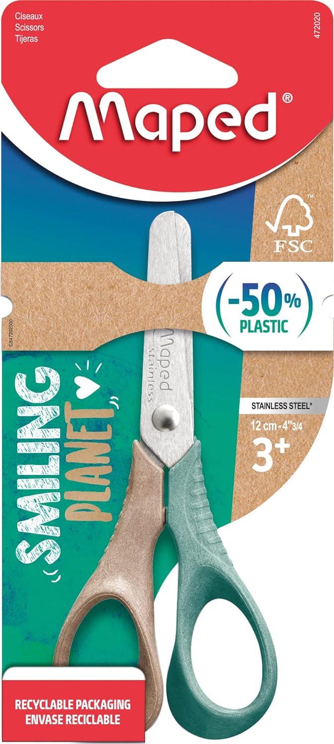 The Maped Sustainable Smiling Planet Vivo Scissors, featuring a 12cm (approximately 4.7 inches) blade length and 3D shaped handle rings, are a testament to eco-conscious design and functionality. Crafted with sustainability in mind, these scissors are part of Maped's Smiling Planet range, which emphasizes environmentally friendly practices. The use of recycled materials or other eco-friendly components may contribute to reducing the environmental footprint associated with their production. The 3D shaped handle rings are ergonomically designed to provide a comfortable grip, reducing hand fatigue during extended use. This design feature enhances precision and control, making these scissors suitable for various cutting tasks, from crafting to office work. With their eco-friendly construction and ergonomic design, the Maped Sustainable Smiling Planet Vivo Scissors offer a blend of sustainability and practicality, making them an ideal choice for environmentally conscious individuals seeking high-quality cutting tools.