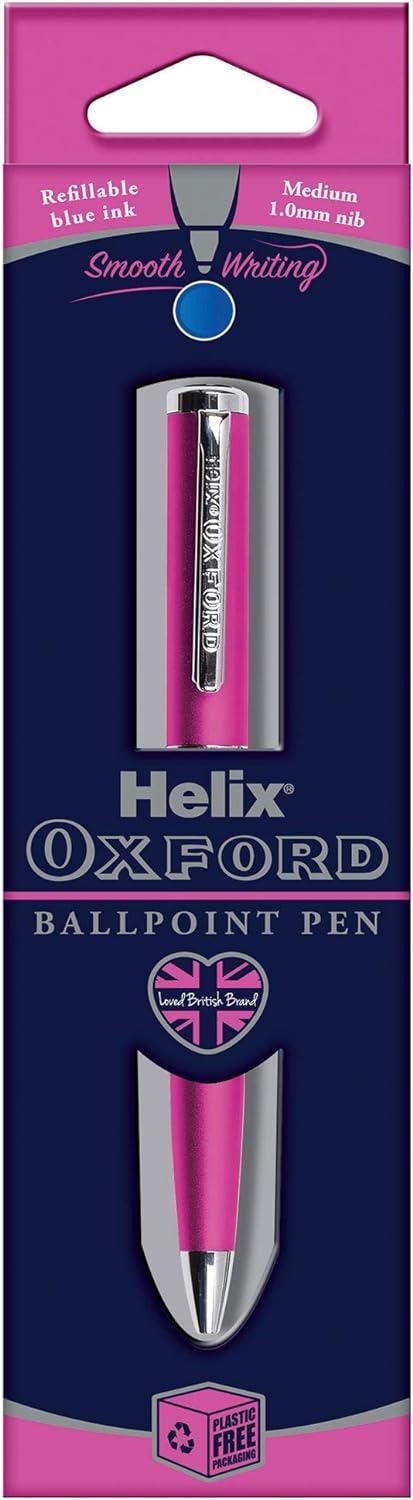 Helix 209822 Oxford Premium Pink Ballpoint Pen (Blue Ink) Plastic Free Packaging Balanced metal barrel that is rounded and comfortable to hold Consistent ink flow for smooth writing Embossed Helix Oxford lid clip Plastic-free cardboard packaging Blue Ink.
